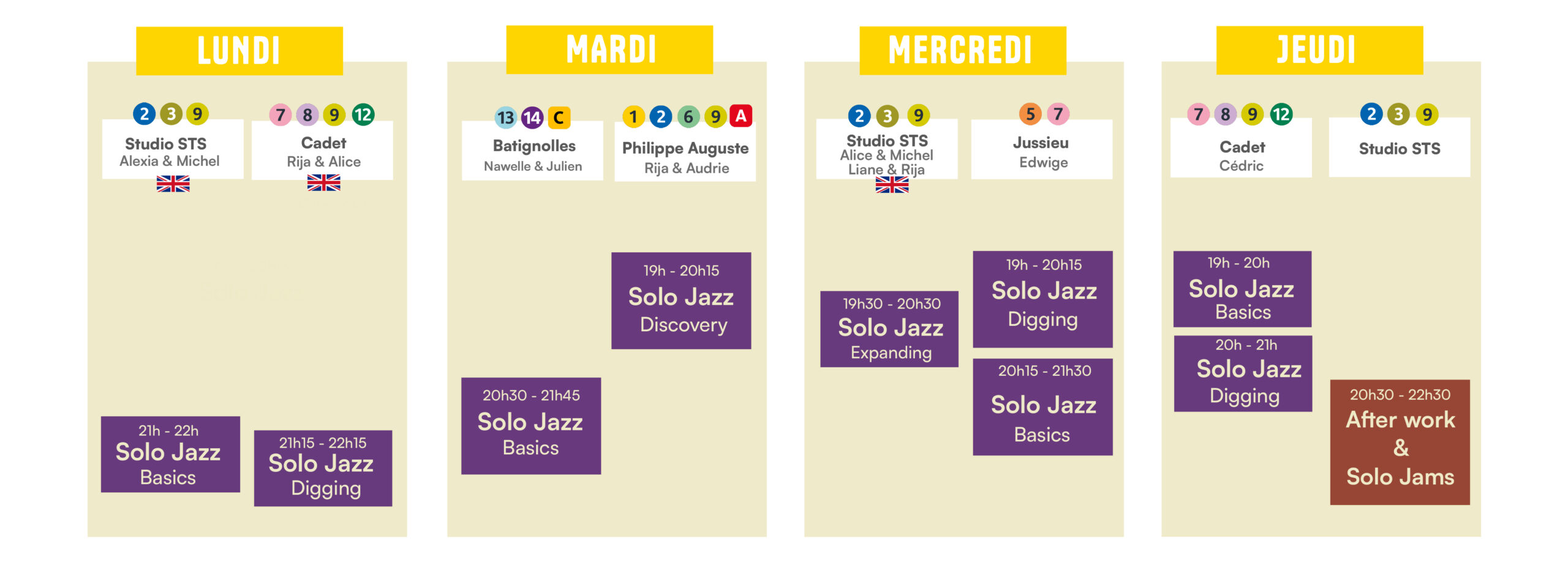 - NOUVEAU : les cours de Solo Jazz sont maintenant accessibles avec un Pass SOLO JAZZ (10 ou 30 cours), pour apporter un max de flexibilité. Inscrivez-vous pour un pass et utilisez le sans pré-inscription. Venez aux cours qui vous plaisent, en fonction de votre emploi du temps et de votre niveau du moment !