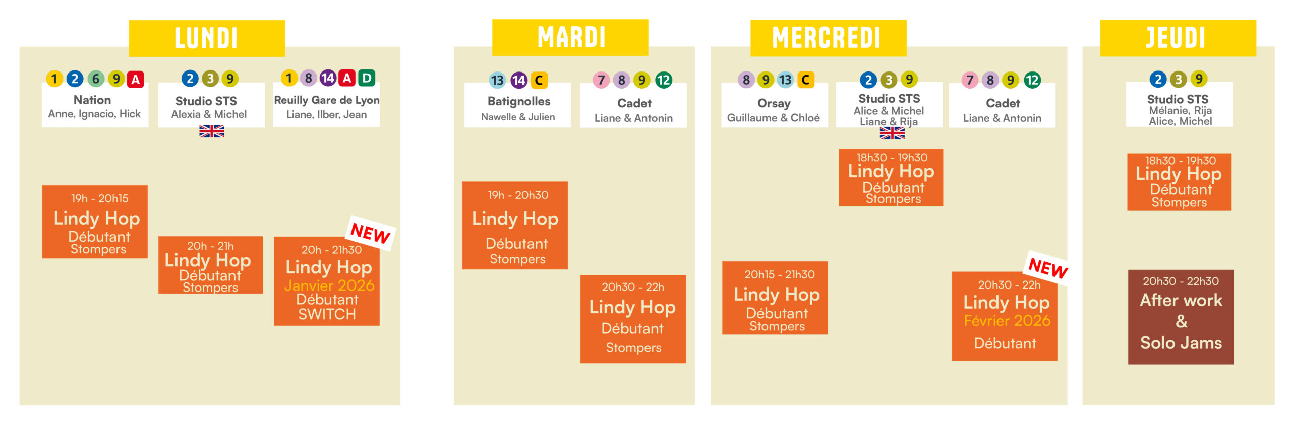 Cette saison, nous vous avons préparé pas moins de 7 niveaux en Lindy Hop et 4 en Charleston Solo. Afin de vous orienter dans un groupe qui vous correspondra au mieux, nous prenons également en compte votre disponibilité pour pratiquer en dehors des cours.