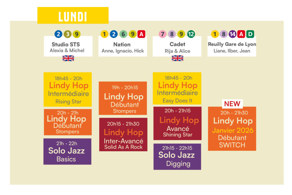 - NOUVEAU : les cours de Solo Jazz sont maintenant accessibles avec un Pass SOLO JAZZ (10 ou 30 cours), pour apporter un max de flexibilité. Inscrivez-vous pour un pass et utilisez le sans pré-inscription. Venez aux cours qui vous plaisent, en fonction de votre emploi du temps et de votre niveau du moment !