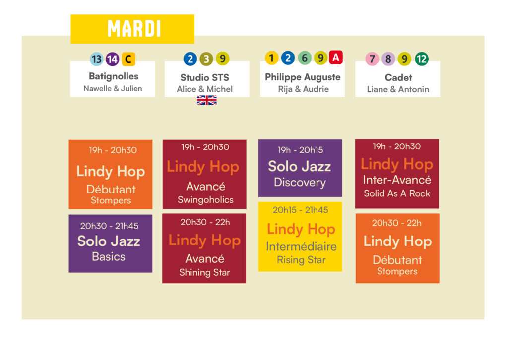Cette saison, nous vous avons préparé pas moins de 7 niveaux en Lindy Hop et 4 en Charleston Solo. Afin de vous orienter dans un groupe qui vous correspondra au mieux, nous prenons également en compte votre disponibilité pour pratiquer en dehors des cours.