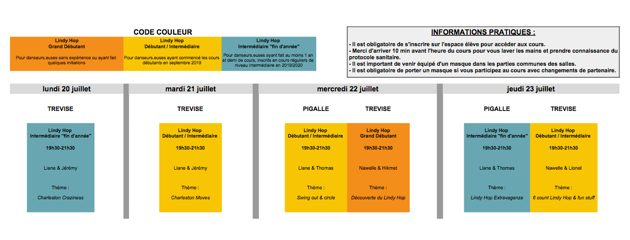 - jeudi 23 juillet de 19h30 à 21h30 : Lindy Hop intermédiaire “fin d’année” – thème “Lindy Hop Extravaganza” (salle Pigalle)