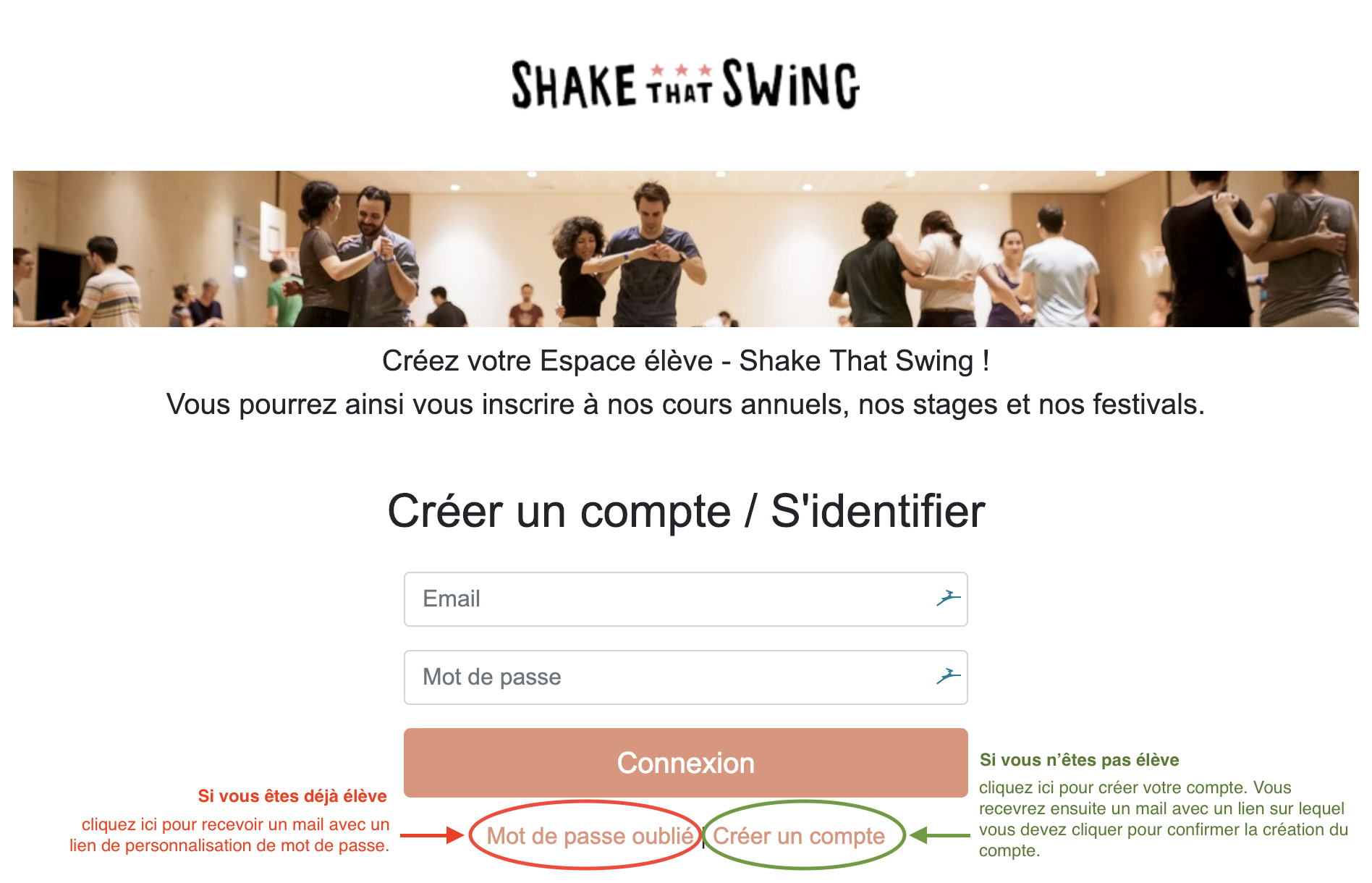 - créez votre compte personnel Shake That Swing sur notre “espace élèves”. Si vous êtes déjà élève des cours hebdomadaires, passez par la fonction “Mot de passe oublié” pour personnaliser votre mot de passe (vous avez déjà un espace élève créé 😉)